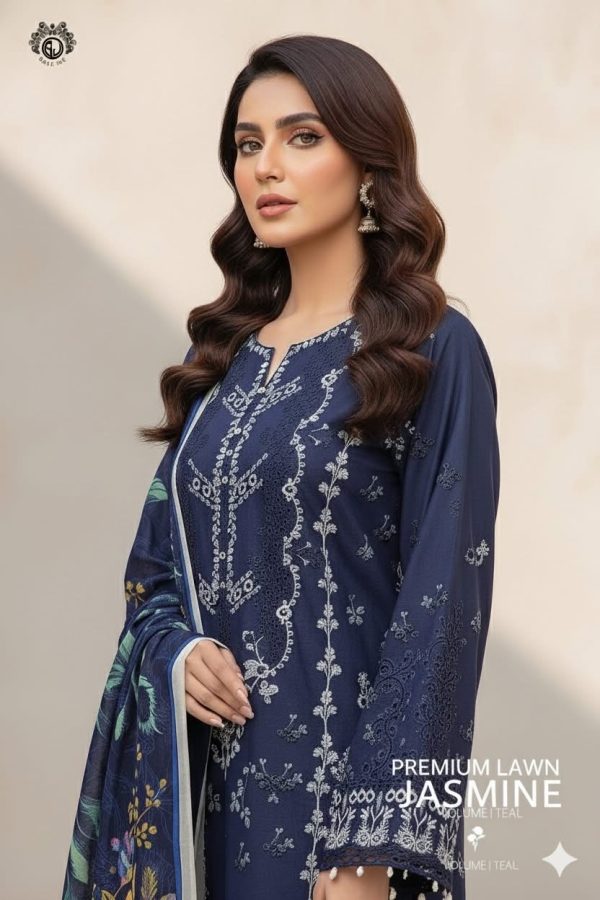 JASMINE Lawn Unstitched Collection is a premium quality original Pakistani lawn suit, perfect for summer wear, Eid, casual outings, and party wear. The fabric is soft, comfortable, and elegant, designed with beautiful prints and fine embroidery that gives a luxurious look.